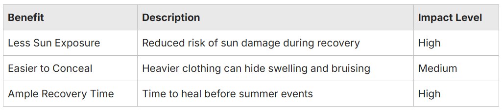 This table illustrates the key benefits of scheduling cosmetic procedures during the winter months, highlighting how these factors contribute to a more successful recovery experience.